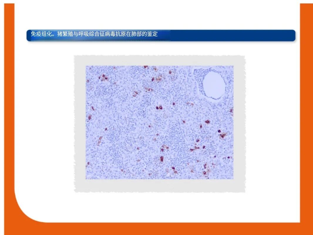 PRRS virus antigen or nucleic acid can be detected in tissues by IHC and ISH, respectively. The relationship between viral detection and lesions can be established by a combination of IHC or ISH and histopathology. PRRSV抗原或核酸可分别通过免疫组化和原位杂交进行检测。病毒检测与病理变化之间的关系可以通过IHC或ISH与组织病理学的结合分析来建立。