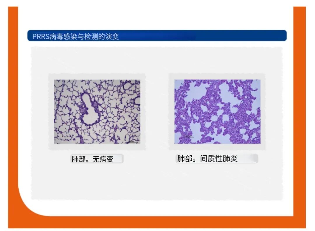 Microscopically, interstitial pneumonia is the primary lesion, but it is nonspecific for PRRS virus. 显微镜下,间质性肺炎为原发病变,但并不是PRRS特征性病变。