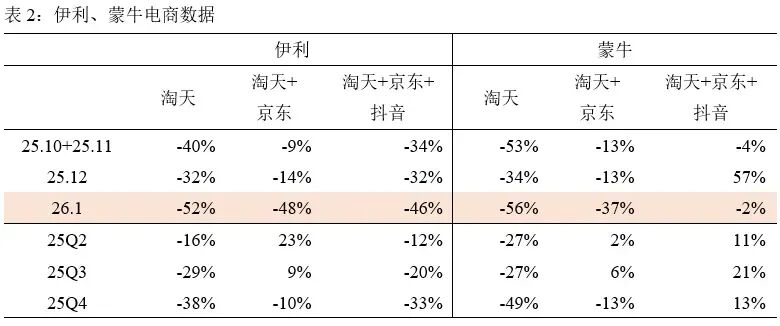 淘天口径液奶销售额同比暴跌40%。官方解释是"春节错位"——2025年春节假期启动早,1月前半月就进入了"过年模式",物流停摆、消费者忙着囤货而非网购,基数自然畸高。但这话只能信一半。即便剔除春节因素,双位数下滑的底色依然刺眼:需求疲软,已经不是秘密,而是正在公开化。