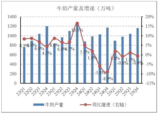 更尴尬的是产量。存栏降了,但单产在涨,2025年全年原奶产量居然微增0.3%。直到四季度,才出现0.6%的同比下滑。去产能?去的不过是"边际增量",而非"存量负担"。