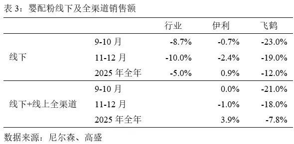伊利算是"矮子里拔将军",全年线下表现优于行业,但25年最后四个月也未能幸免,录得下滑。飞鹤则更惨,下滑幅度"较大"——具体数字虽被隐去,但行业人士的默契是:当报告用"较大"形容时,往往意味着两位数起步。
