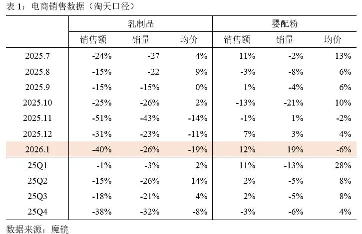 更微妙的是结构分化。婴配粉线上倒是涨了,淘天口径销售额同比 12%,销量更是飙了19%。但别急着欢呼——价格同比掉了6%,典型的"以价换量"。而且京东那边拖了后腿,同比下降7%,导致淘天 京东合并口径仅增长1%。往前看,12月还是7%的增速,全年更是10%的涨幅,如今1月几乎"归零"。这哪是开门红?分明是开门黑。