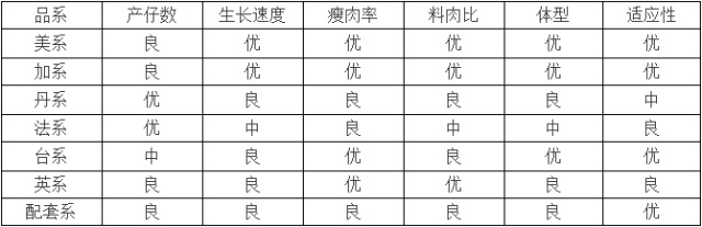 下表从产仔数、生长速度、瘦肉率、料肉比、体型、适应性进行分类比较:
