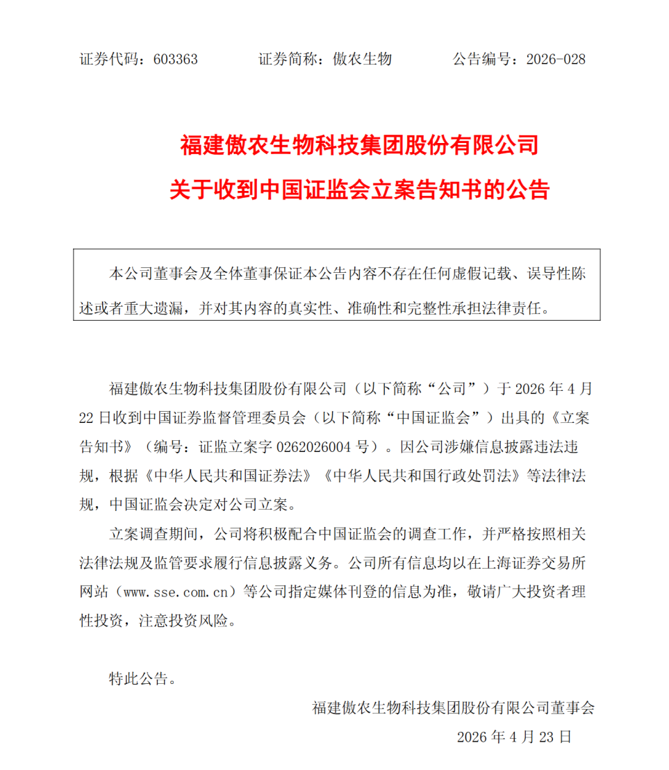 值得注意的是,本次立案告知书的编号显示,这是证监会 2026 年度的第 4 号立案案件,意味着年初监管部门就已经将傲农生物纳入了关注范围。立案消息披露当日,公司股价出现了小幅下跌。作为国内生猪养殖行业的重要企业之一,傲农生物近年来也受到了行业周期的深度影响,经营面临着不小的压力。这次被立案调查,无疑会给公司的后续发展带来更多不确定性,也让行业内对企业的合规经营问题更加重视。