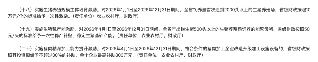 针对大家最关心的现金流与基础产能稳定问题,四川明确,2026 年 4 月 1 日至 12 月 31 日期间,对全省年出栏 500 头以上的养殖场所饲养的能繁母猪,省级财政按 50 元 / 头的标准给予一次性稳产补贴,直接为养殖核心产能提供支持,缓解养殖场户的资金压力,避免大家因短期亏损出现恐慌性淘汰能繁母猪的情况。针对中小养殖场的标准化升级,当地也给出明确激励,2026 年全年,省内饲养量首次达到 2000 头以上的生猪养殖场,省级财政给予 10 万元 / 个的一次性奖励,引导散养户和中小规模场逐步向标准化、规模化养殖转型。除此之外,四川还将政策延伸至产业链下游,对符合条件的猪肉加工企业设施设备改造升级,按投资额给予补助,单个企业最高补助可达 800 万元,推动产业从单纯的生猪养殖,向精深加工、品牌化运营延伸,拉长产业链条,提升产品附加值,从消费端反向支撑整个产业的稳定发展。