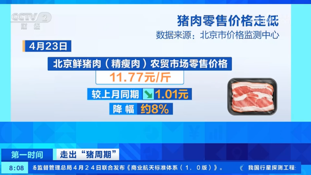 不同零售渠道的市场反馈存在差异,盒马十里堡店的白猪肉类价格整体有 10% 的下浮,对应销量有 10% 到 20% 的增长,其中五花肉价格下滑幅度比排骨类更大,而黑猪、有机猪肉的价格波动则并不明显。北京市价格监测中心 4 月 23 日的数据显示,北京农贸市场鲜猪肉精瘦肉零售价格为 11.77 元每斤,较上月同期下降 8%,超市零售价格为 13.99 元每斤,较上月同期下降 4%,而批发端的价格下行更为明显,近一个半月里,新发地猪肉销售均价一度处在 8 年历史最低位,跌破 12 元每公斤,近 3 到 5 天才小幅超过 12 元,和去年同期相比降幅达到 27.7%。