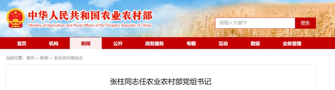 张柱同志任农业农村部党组书记